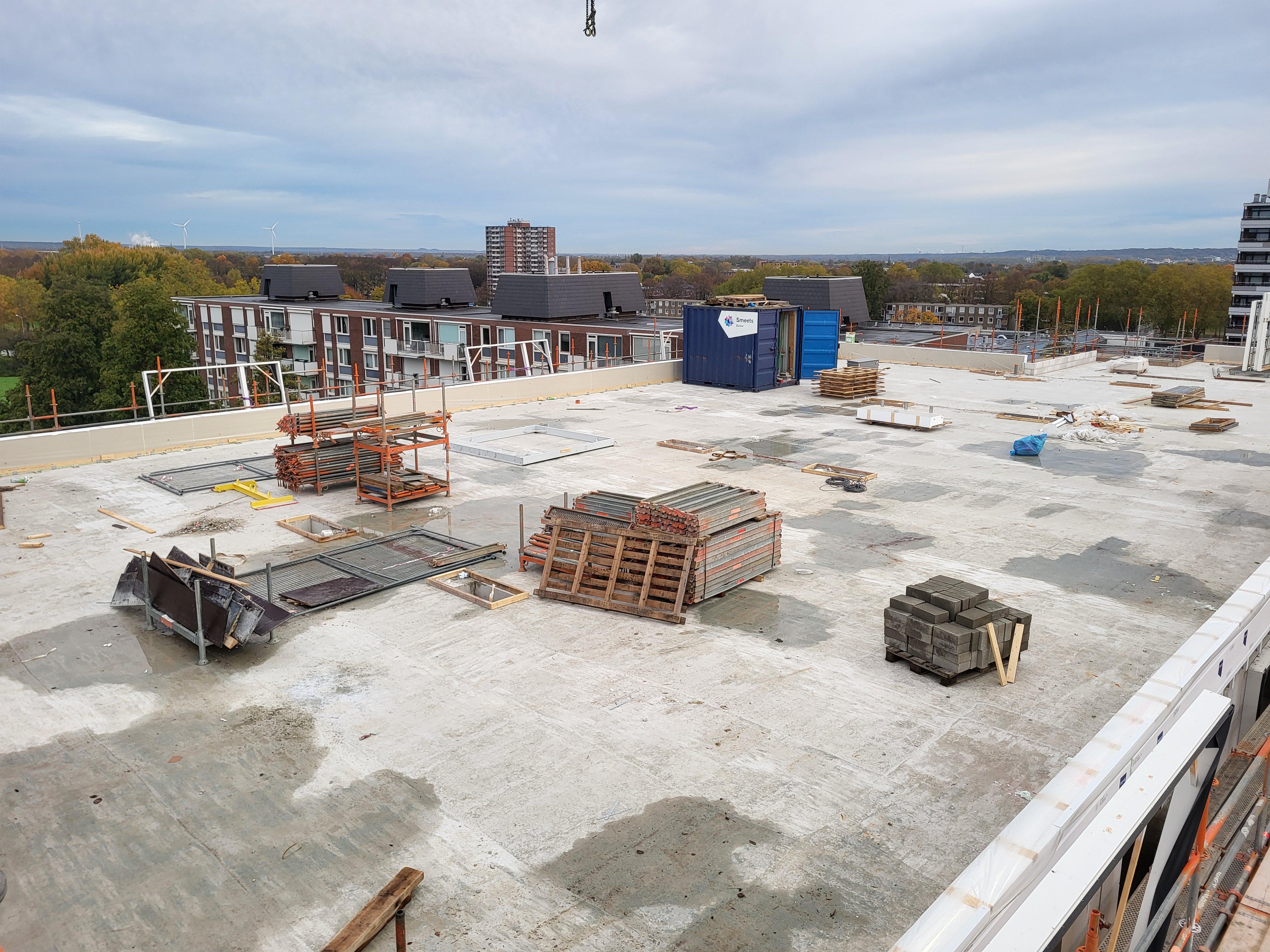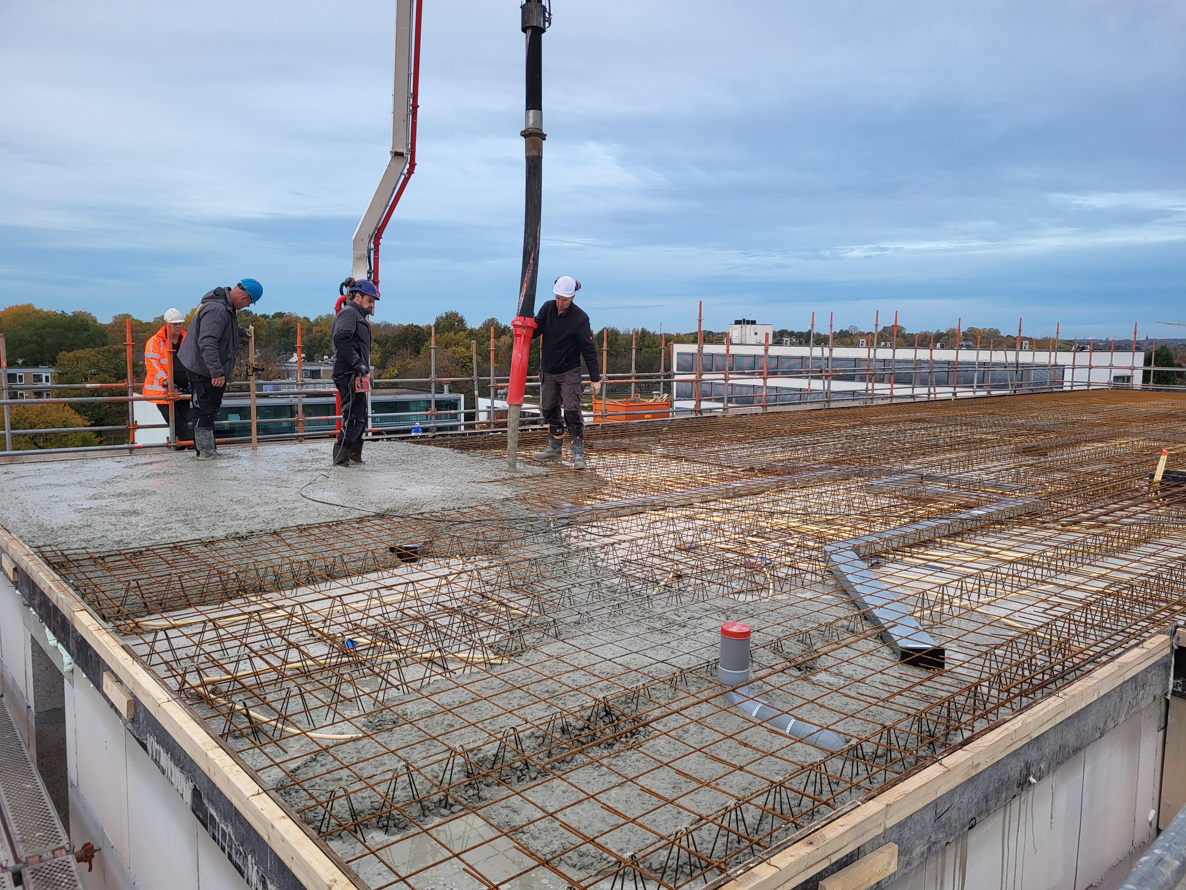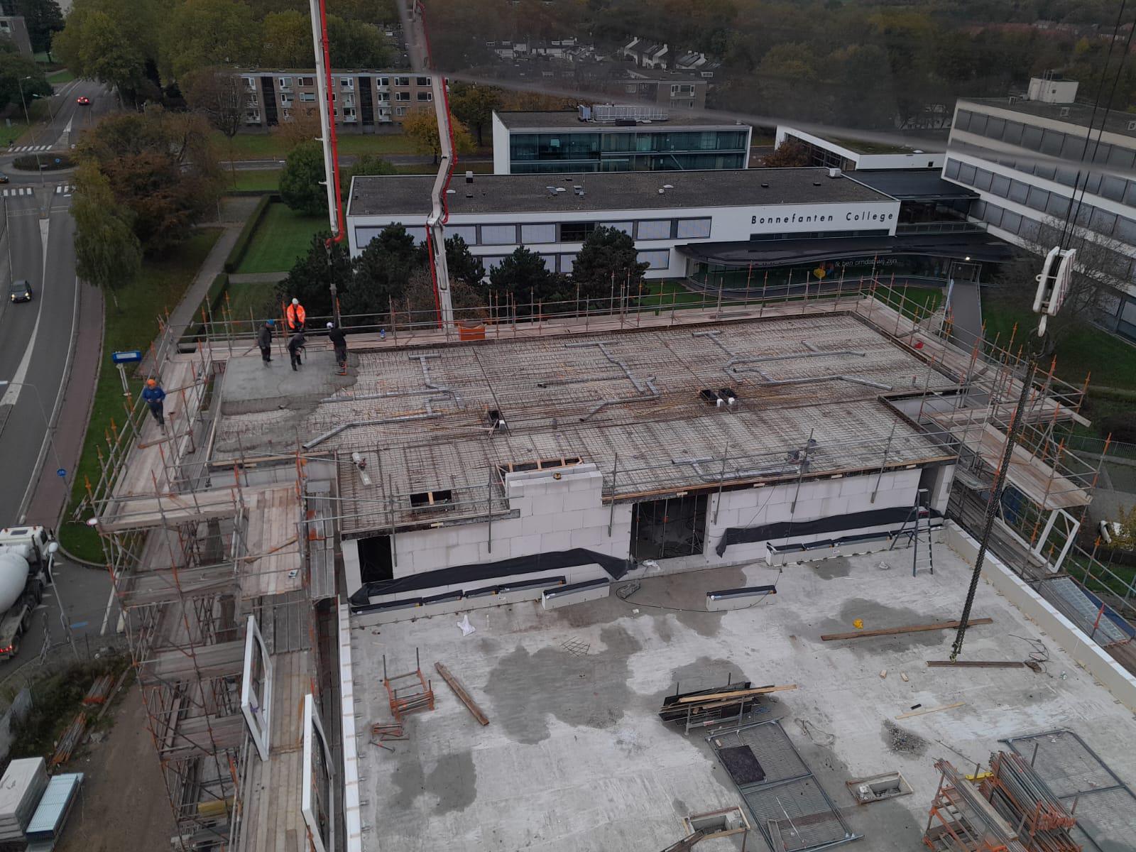Met het storten van de dakvloer naderen wij het hoogste punt.  De dakdekker zal in week 45 starten met haar werkzaamheden om er zo voor te zorgen dat het gebouw waterdicht zal zijn. De ruwbouw verloopt voorspoedig en de contouren van de gevels worden nu goed zichtbaar.