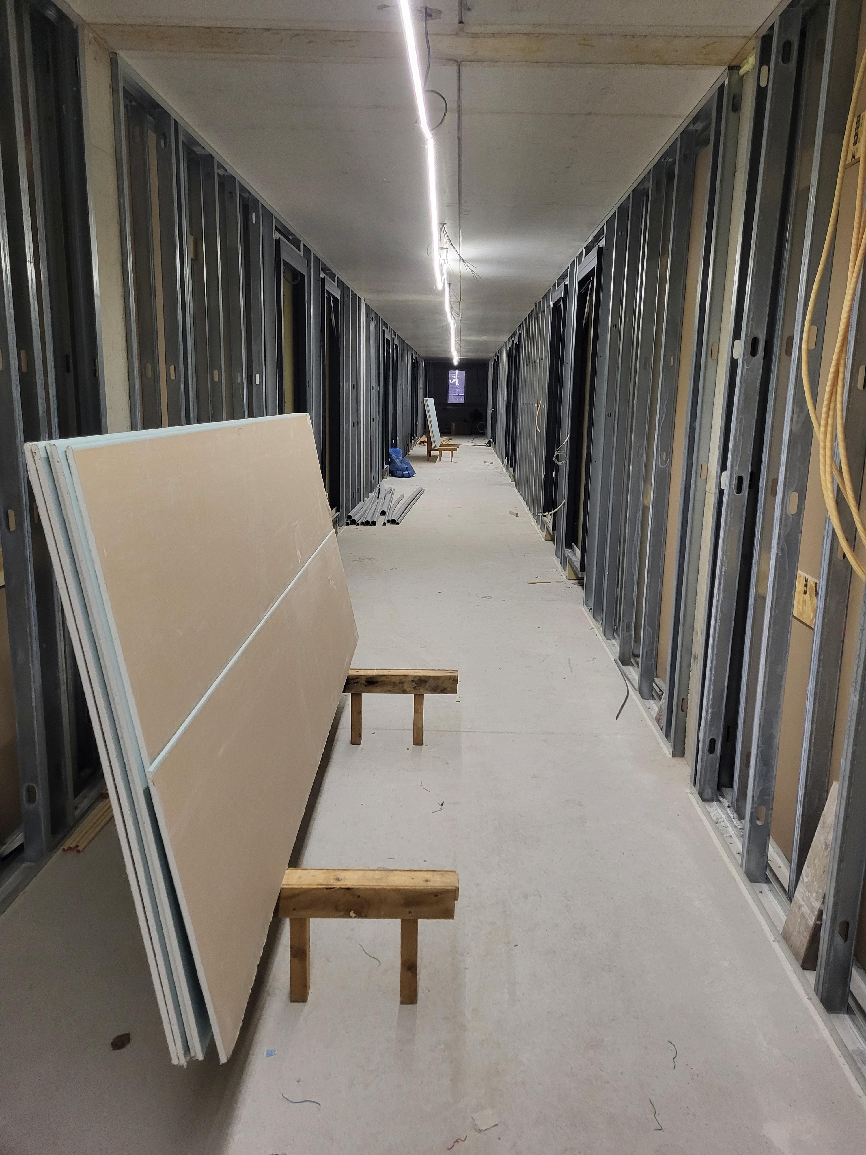 Ook binnen zitten wij niet stil. De Metall stud wanden worden geplaatst en de installateurs zijn druk bezig met het aanleggen van alle benodigde leidingen. De eerste gietdekvloeren zijn al ingepland en zullen dit jaar nog worden aangebracht.